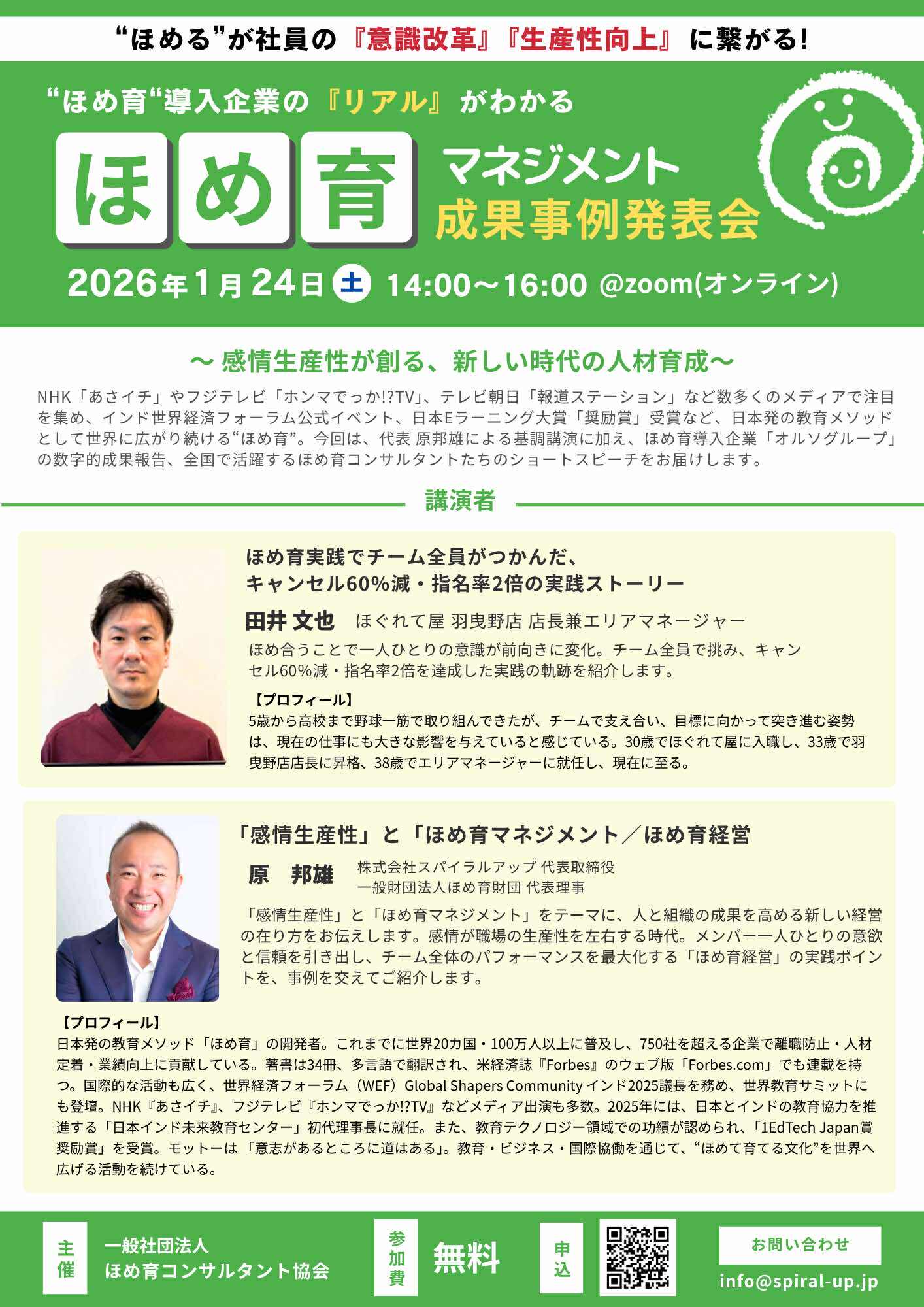 ほめ育がどのように組織の変化と成果につながるのか、実際の事例とともに学べる貴重な機会です。